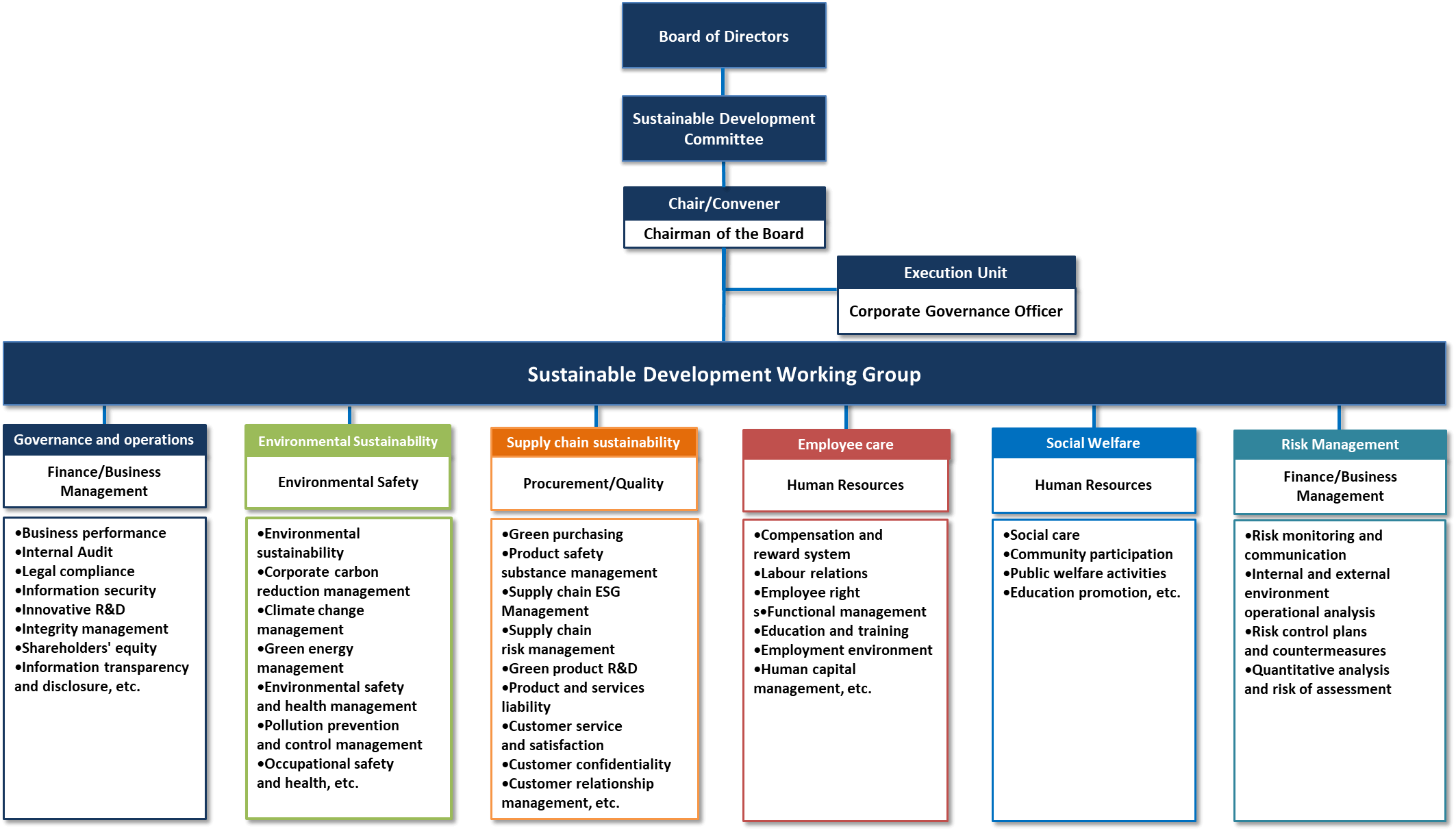 The chairman of the Board, Mr. Fang, Jung-Hsi, serves as the convener. The Sustainable Development Committee is currently divided into six functional groups, namely “Governance Operations”, “Environmental Sustainability”, “Supply Chain Sustainability”, “Employee Care”, “Social Welfare” and “Risk Management”. The first-level supervisors of each relevant functional unit are responsible for promoting and responding to various issues to embody corporate social responsibility at four levels which include implementing corporate governance, developing a sustainable environment, safeguarding social welfare and improving information transparency.