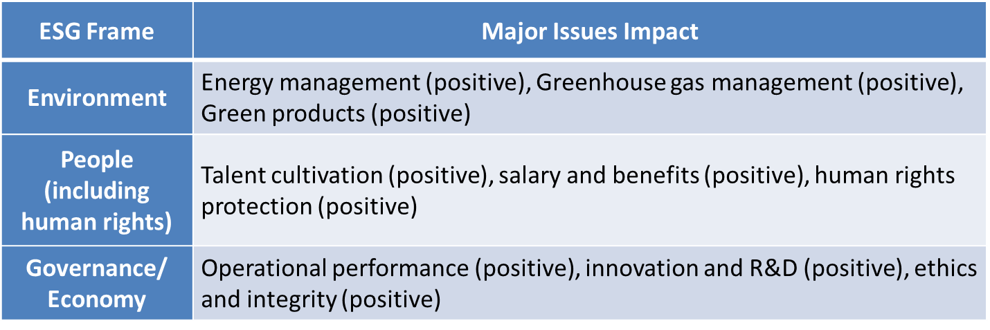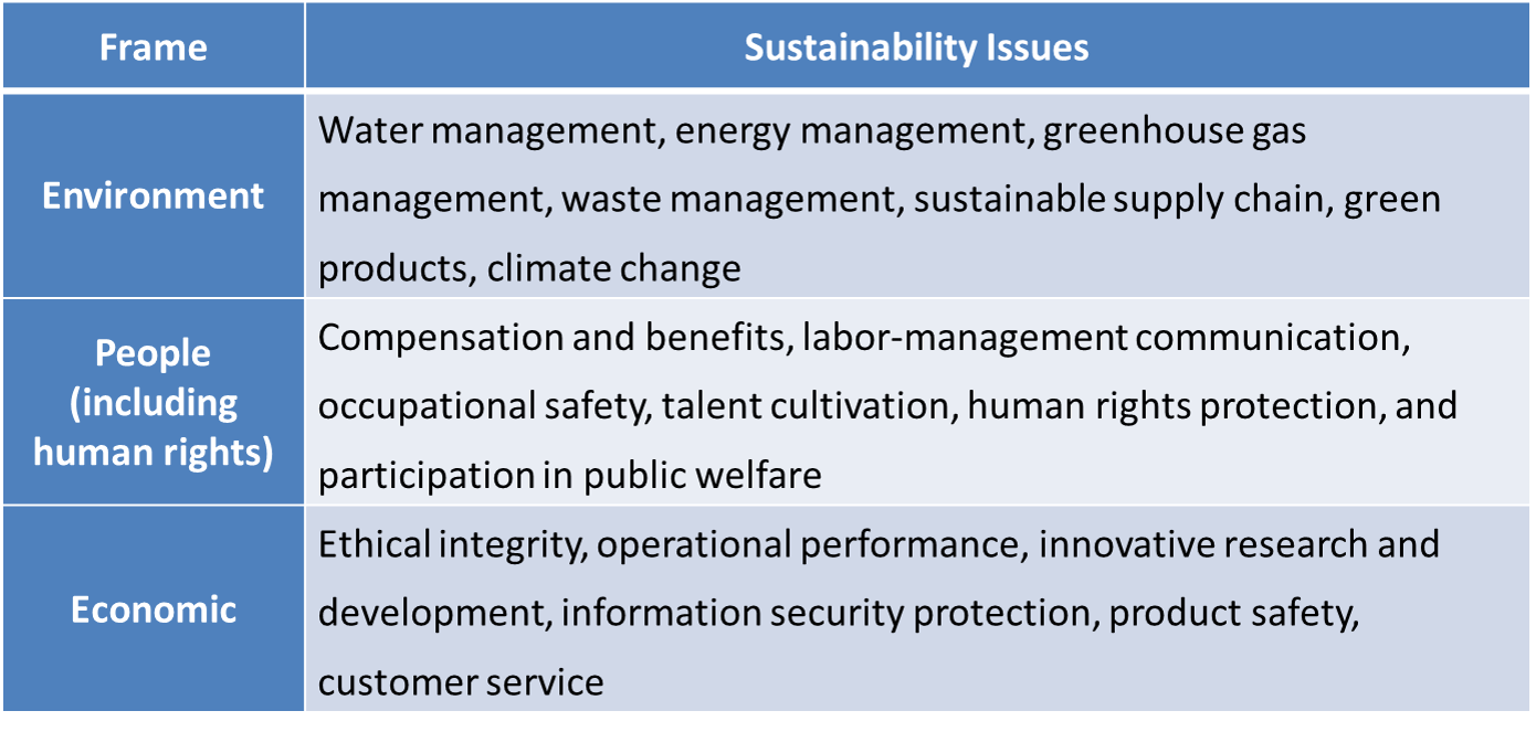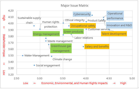 | Government agencies | Supervision and auditing of compliance with various regulations by government agencies. | – Talent development – Human rights protection – Sustainable supply chain – Regulatory compliance – Ethical integrity – Climate change – Energy management – Greenhouse gas management – Green products – Operational performance – Compensation and benefits – Occupational safety – Innovation and research development |
