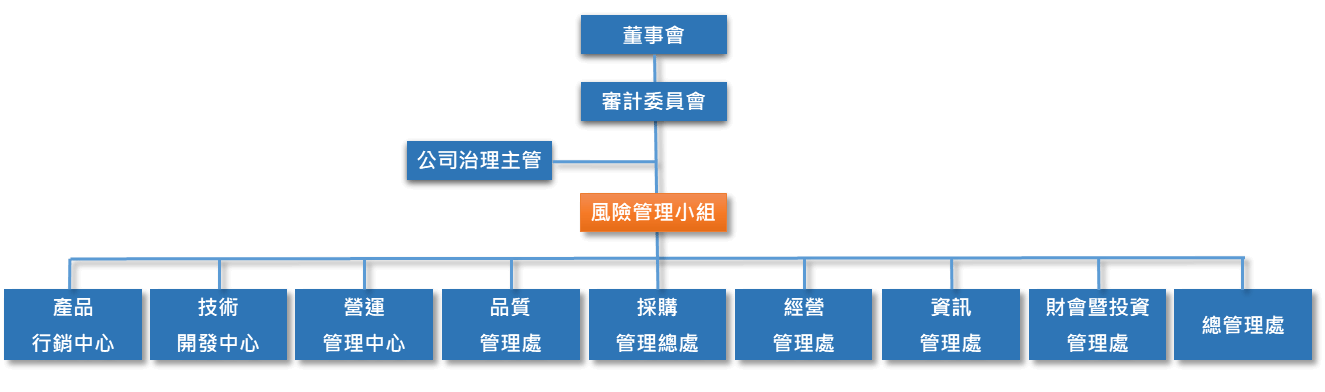 權責單位監控所屬業務的風險並提出因應對策,並將風險及因應對策提供風險管理小組,並由風險管理小組彙整後出具風險管理報告,由公司治理主管彙整後提報公司審計委員會,審計委員會負責監督及確保風險管理之執行,每年至少一次向董事會報告整體風險管理結果。