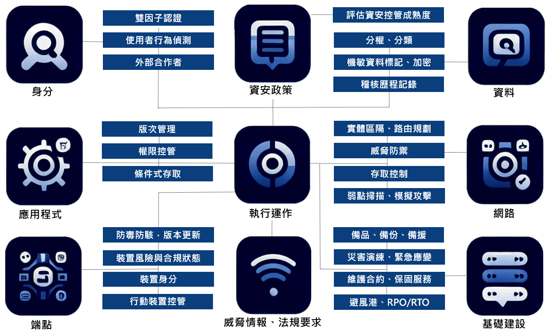 - 管理上以【零信任架構】從政策制度、組織職責、資產管理、存取控制、實體環境、人力安全、文件管控、通訊與作業管理、系統開發與維護、營運持續管理、安全事件管理、法規遵循性等方面制訂相關管理規範。